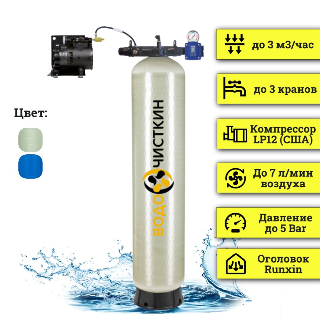 ARX 1465LP – это автоматизированная и полностью укомплектованная система аэрации воды, предназначенная для принудительной обработки воды воздухом в закрытых (напорных) системах обезжелезивания, деманганации или осветления воды. Основываясь на одном из наиболее эффективных и экономически выгодных методах обезжелезивания воды, когда железо и марганец извлекаются посредством «кислородного окисления и последующего осаждения», система аэрации воды ARX 1465LP применяется в качестве окислительной ступени, и, для интенсивного обогащения воды ионами кислорода, она генерирует из атмосферы и подает в воду до 8 л/мин чистого воздуха, что на базе корпуса 14х65 дюйма позволяет ей обеспечить скорость фильтрации до 3 м3/час. Также, помимо выполнения окислительного воздействия, система аэрации воды обеспечивает эффективную очистку от ряда неблагоприятных газообразных соединений, таких как: сероводород, аммиак, углекислый газ, и, что не мало важно для окисления железа и в особенности марганца, она не значительно повышает значение уровня Ph. Система аэрации воды ARX 1465LP экологически чиста, экономична и абсолютно безопасна, она превосходно подойдет для обезжелезивания скважинной, колодезной или общегородской воды, как в питьевых или хозяйственно-бытовых нуждах (в квартире, загородном доме, на даче, в коттедже), так и в малых или больших объектах коммерческого, промышленного или энергетического назначения.