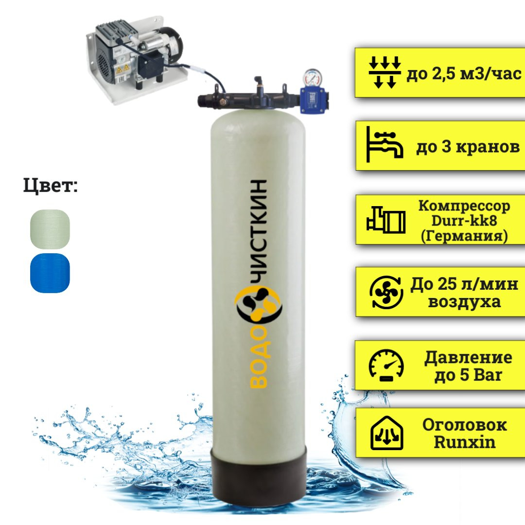 ARX 1354DR – это автоматизированная и полностью укомплектованная система аэрации воды, предназначенная для принудительной обработки воды воздухом в закрытых (напорных) системах обезжелезивания, деманганации или осветления воды. Основываясь на одном из наиболее эффективных и экономически выгодных методах обезжелезивания воды, когда железо и марганец извлекаются посредством «кислородного окисления и последующего осаждения», система аэрации воды ARX 1354DR применяется в качестве окислительной ступени, и, для интенсивного обогащения воды ионами кислорода, она генерирует из атмосферы и подает в воду до 25 л/мин чистого воздуха, что на базе корпуса 13х54 дюйма позволяет ей обеспечить скорость фильтрации до 2,5 м3/час. Также, помимо выполнения окислительного воздействия, система аэрации воды обеспечивает эффективную очистку от ряда неблагоприятных газообразных соединений, таких как: сероводород, аммиак, углекислый газ, и, что не мало важно для окисления железа и в особенности марганца, она не значительно повышает значение уровня Ph. Система аэрации воды ARX 1354DR экологически чиста, экономична и абсолютно безопасна, она превосходно подойдет для обезжелезивания скважинной, колодезной или общегородской воды, как в питьевых или хозяйственно-бытовых нуждах (в квартире, загородном доме, на даче, в коттедже), так и в малых или больших объектах коммерческого, промышленного или энергетического назначения.