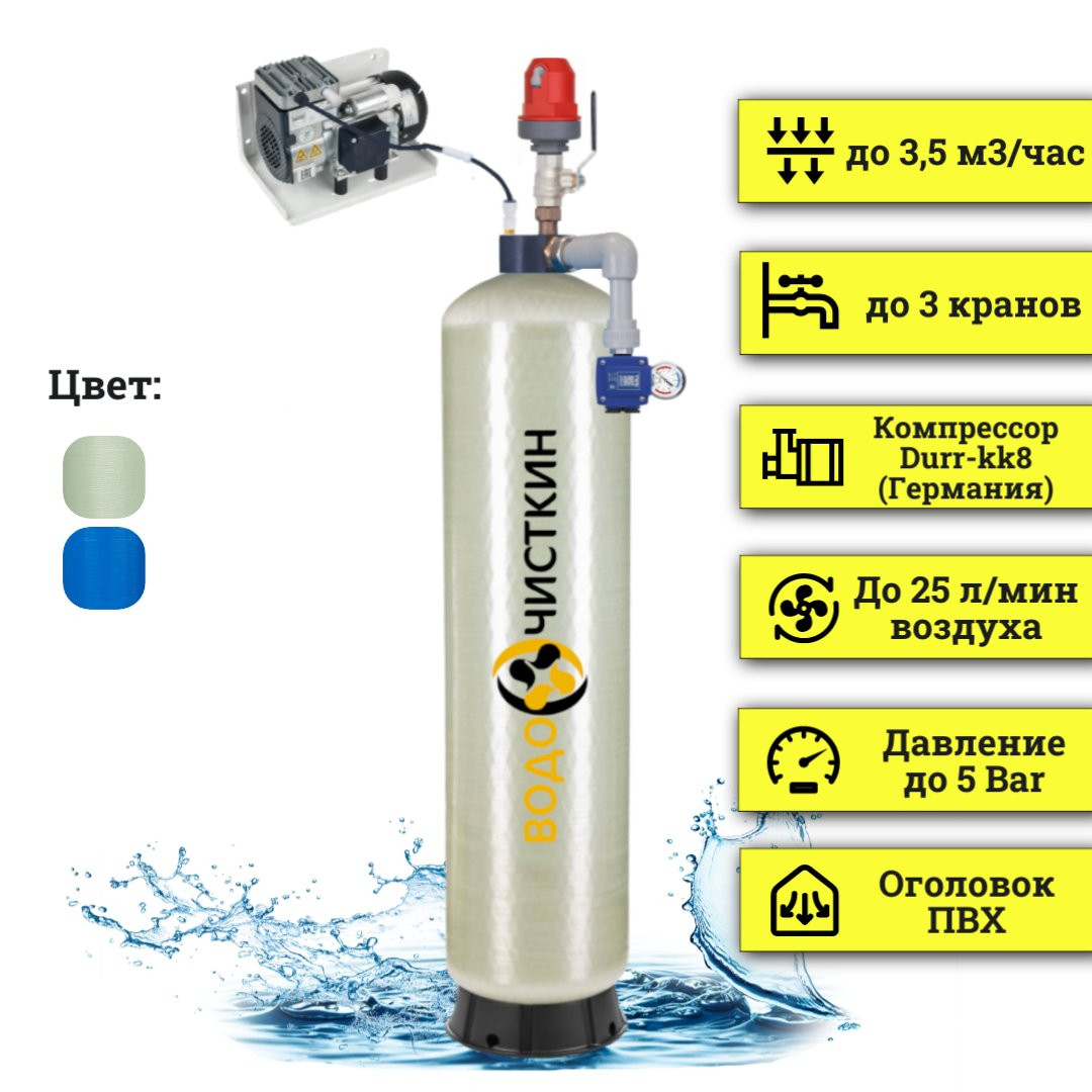 ARX 1665DR – это автоматизированная и полностью укомплектованная система аэрации воды, предназначенная для принудительной обработки воды воздухом в закрытых (напорных) системах обезжелезивания, деманганации или осветления воды. Основываясь на одном из наиболее эффективных и экономически выгодных методах обезжелезивания воды, когда железо и марганец извлекаются посредством «кислородного окисления и последующего осаждения», система аэрации воды ARX 1665DR применяется в качестве окислительной ступени, и, для интенсивного обогащения воды ионами кислорода, она генерирует из атмосферы и подает в воду до 25 л/мин чистого воздуха, что на базе корпуса 16х65 дюйма позволяет ей обеспечить скорость фильтрации до 3,5 м3/час. Также, помимо выполнения окислительного воздействия, система аэрации воды обеспечивает эффективную очистку от ряда неблагоприятных газообразных соединений, таких как: сероводород, аммиак, углекислый газ, и, что не мало важно для окисления железа и в особенности марганца, она не значительно повышает значение уровня Ph. Система аэрации воды ARX 1665DR экологически чиста, экономична и абсолютно безопасна, она превосходно подойдет для обезжелезивания скважинной, колодезной или общегородской воды, как в питьевых или хозяйственно-бытовых нуждах (в квартире, загородном доме, на даче, в коттедже), так и в малых или больших объектах коммерческого, промышленного или энергетического назначения.