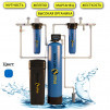 - Ступень II: Фильтр комплексной очистки, построенный на основе управляющего клапана Runxin серии P, корпуса из стекловолокна (размер варьируется по производительности), дренажно-распределительной системы и многокомпонентной смолы. Благодаря ионообменным качествам засыпки и наличию анионитного слоя, данный блок эффективно удаляет соединения железа и марганца, органику и соли жёсткости. Автоматическая промывка этого фильтра проводится концентрированным раствором хлорида натрия (таблетированной солью), который подаётся из специального бака посредством управляющего блока.