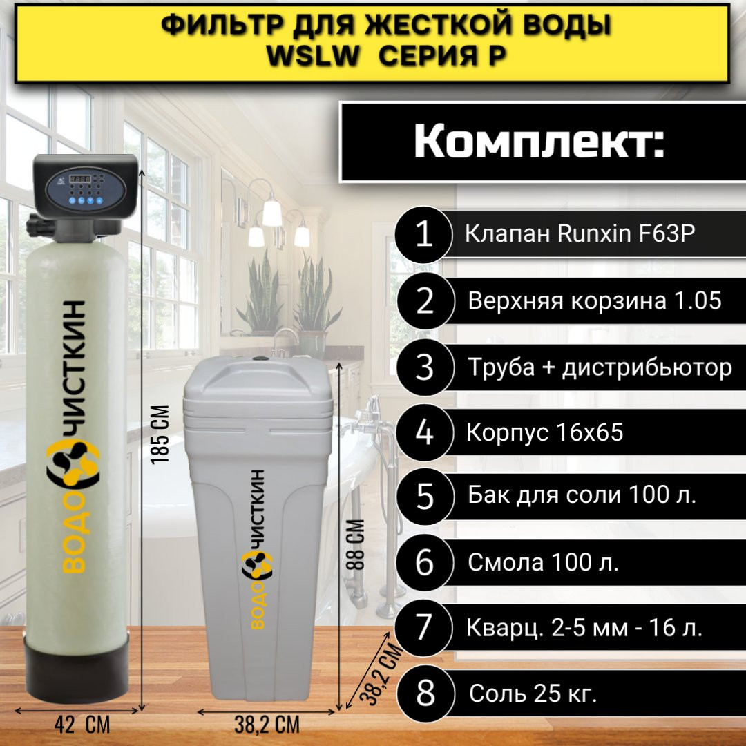Фильтр для жесткой воды WSLW 1665P собрана из долговечных и общедоступных компонентов, а управление фильтром осуществляется клапаном Runxin моделей F63P, обеспечивающим контроль. Клапан оснащен панелью управления с кнопками и дисплеем для настройки, и установлен на прочный 16х65-дюймовый корпус. Внутри корпуса расположены: водоподъемная/дистрибьюторная труба, фильтрующая корзина, песчаная подложка и слой фильтрующего материала. Рядом с корпусом находится 100-литровый бак для реагента, в котором соль и вода смешиваются, образуя раствор, который затем поступает в фильтр для восстановления (промывки) наполнителя. Для подключения система WSLW 1665P имеет четыре точки: вход и выход воды, слив дренажа и соединение реагентной (солевой) линии.